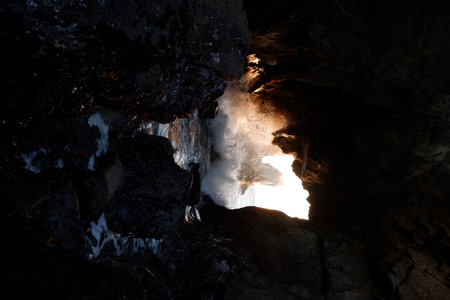Waves rolling in from the pacific ocean and crashing into rocks at the entrance of a cave in the rays of the sun