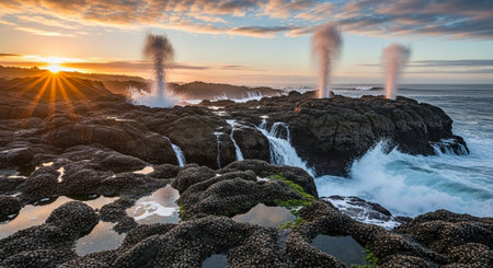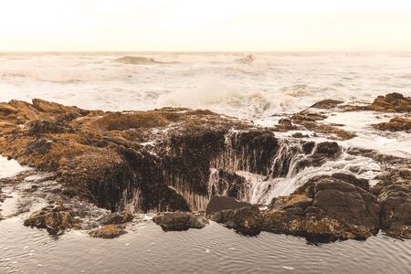 Ocean beach waves at Thor's Well in Cape Perpetua, Oregon Coast, USA.