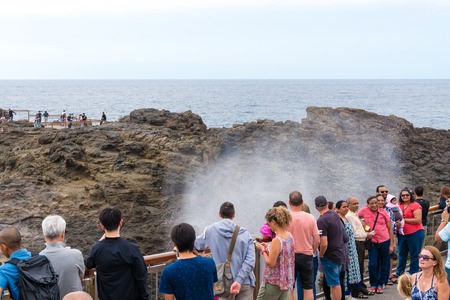 Kiama, NSW, Australia-March 31, 2018: Tourists visiting Kiama Blowhole, one of the largest blowholes in the world, a sea-cliff cavern that spouts seawater high in the air, South Coast, NSW, Australia