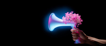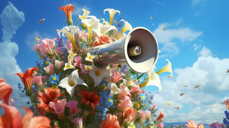 megaphone in hands with flowers on a blue background, by ai generative