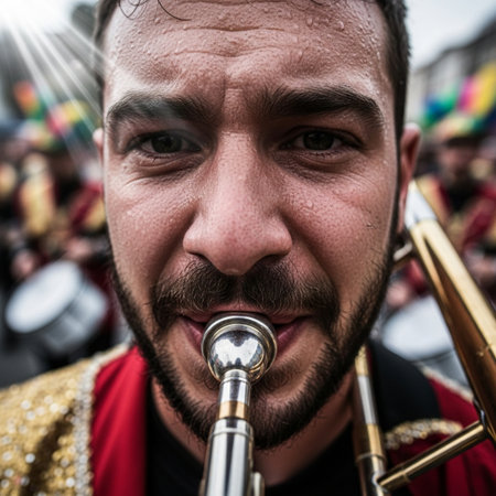 Editorial macro photograph capturing the intense focus and physical effort of a street musician play