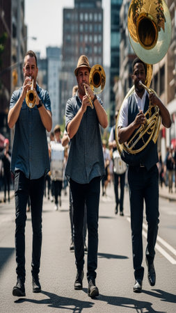 Dynamic vertical shot of energetic musicians playing brass instruments (trumpet, trombone, sousaphon
