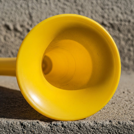 Hero detail shot of a bright yellow Vuvuzela's bell, dominating a square frame. The focus is on the
