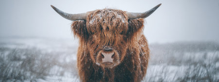 A close-up shot presents a Highland cow against a blurred winter background. The cow is distinguished by its long, brown fur and impressive horns. The scene showcases a natural, outdoor environment possibly suitable for various commercial or editorial applications such as articles or advertising campaigns.