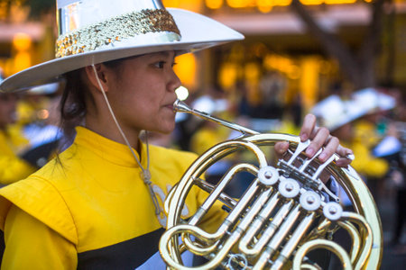 BANGKOK, THAILAND - DEC 5, 2014: Unidentified participants in the celebration of the 87th birthday of Thailand King Bhumibol Adulyadej, is also known as Rama IX, ninth monarch of the Chakri Dynasty.