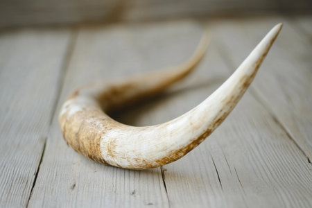 A curved animal horn rests on a textured wooden surface showcasing its natural color and shape in a simple rustic setting.