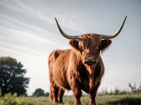 AI Generated. brown highland cow with long horns standing in field looking directly at camera