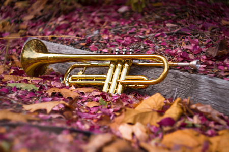 Autumn jazz instrument trumpet standing alone in nature