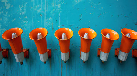 A row of orange traffic cones on a blue wooden wall. Selective focus.