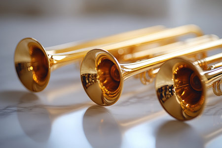A group of golden medieval trumpets in a circular arc proclaiming a special heavenly occasion on light blue cloudy sky background