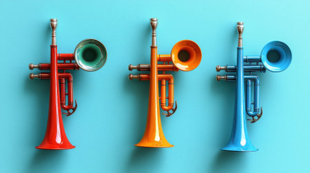 Three colorful trumpets in red, orange, and blue are beautifully arranged against a bright blue background, showcasing their design and vibrant appeal.