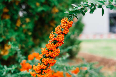 Cluster of a ripening rowan berries, nature bokeh. High quality photo