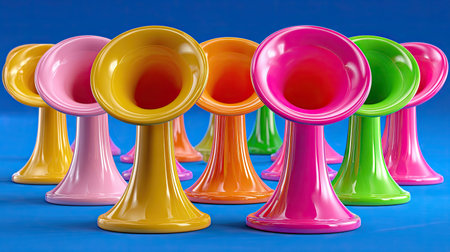 Bright and colorful toy horns create a lively scene on a blue background. Perfect for children's fun, entertainment, parties, and creative designs.