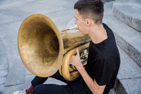 Young street musician playing tuba sitting on granite steps