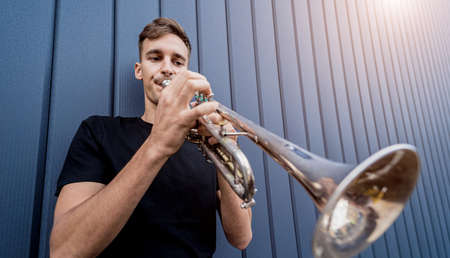 Young street musician playing the trumpet near the big blue wall