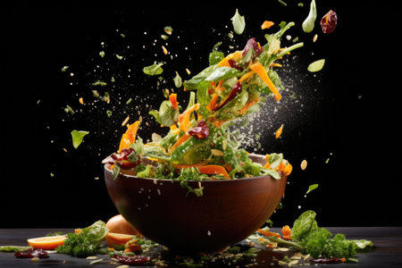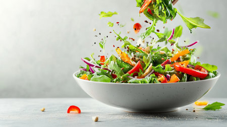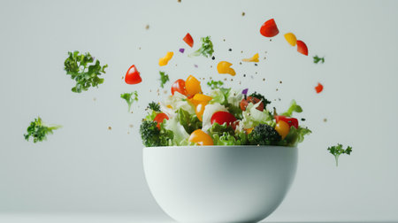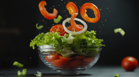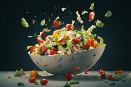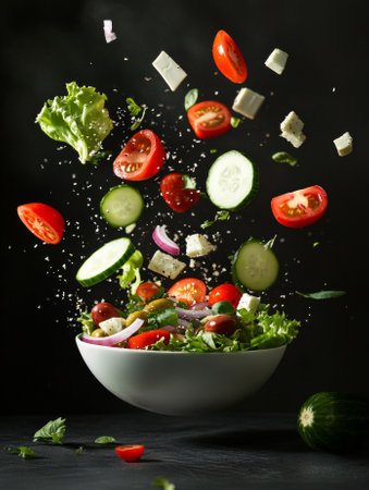 A visually stunning depiction of fresh salad ingredients floating in mid-air, showcasing vibrant colors and textures for an appealing and healthy meal idea.