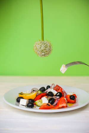 Flying Greek salad bowl. Calorie healthy. Generate AI