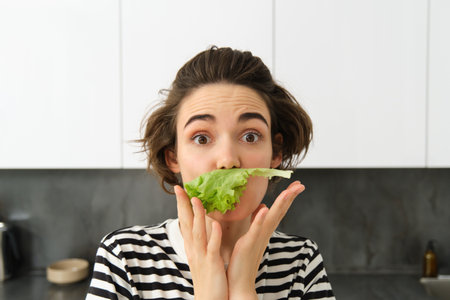 Close up of funny cute woman, vegetarian eating lettuce leaf and smiling, concept of healthy diet, girl likes vegetables, standing in the kitchen