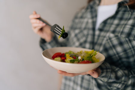 Closeup cropped shot of unrecognizable woman with fork eating fresh salad at kitchen with light interior. Beautiful lady tasting vegetarian food. Closeup vegan female feel happy and enjoy healthy food