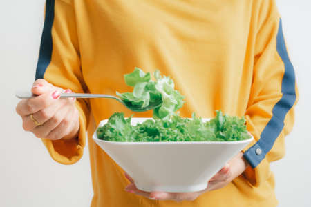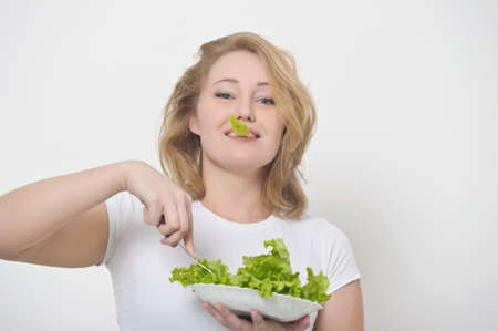 Fat woman on a diet, fresh greens salad. High quality photo.