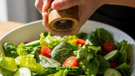 A hand grinds black pepper onto a bowl filled with fresh lettuce, spinach, cherry tomatoes, and cucumber slices for a healthy meal