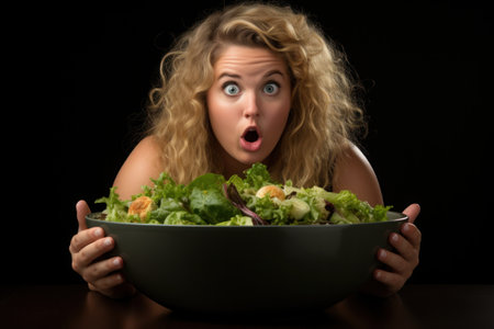 Young big fat lady holding salad bowl sad facial expression facing camera directly. Generative AI.