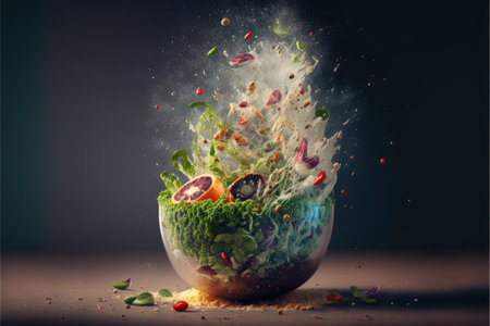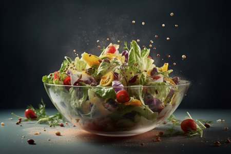 A dynamic shot of fresh salad ingredients in a glass bowl, capturing the essence of healthy eating and culinary creativity, ideal for nutrition and cooking enthusiasts.