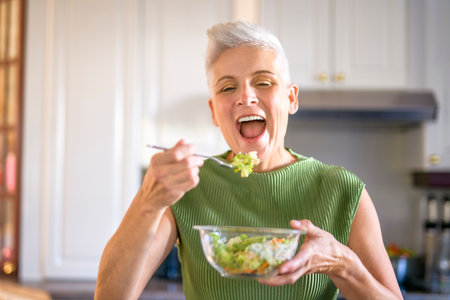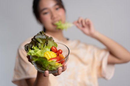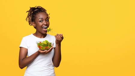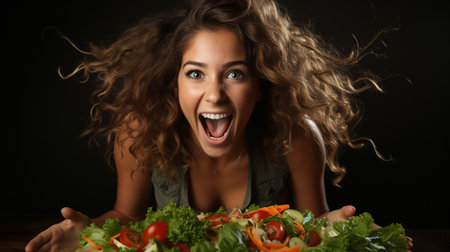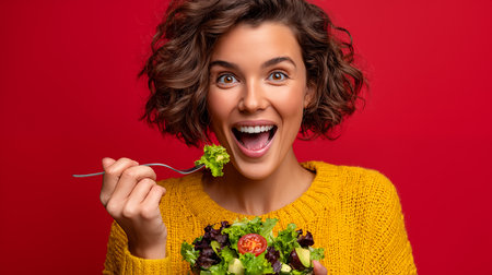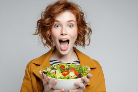 Excited lady enjoying a vibrant salad on a light background amidst a cheerful atmosphere