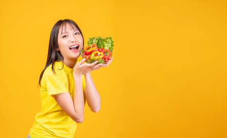 Health care food concept. Excited cheerful young woman slim body holding glass bowl with organic vegetables raised own arm for good healthy while standing over isolated yellow background.