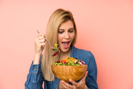 Photo of dreaming optimistic young girl isolated over blue wall background holding salad.