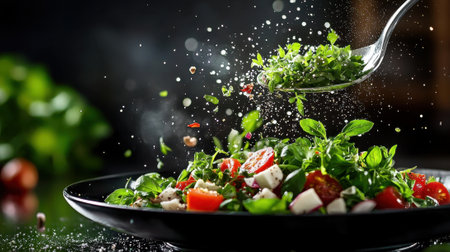 A beautifully arranged salad is being enhanced with fresh herbs. Colorful vegetables and greens fill the plate, while herbs are sprinkled from a large spoon. The kitchen setting is inviting.