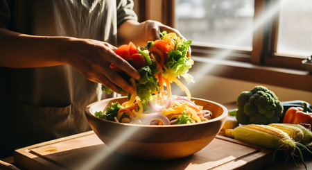 A person's hands tossing a fresh vegetable salad with lettuce, tomatoes, and peppers in a wooden bowl. The backlit scene highlights the freshness of the ingredients and healthy eating habits.
