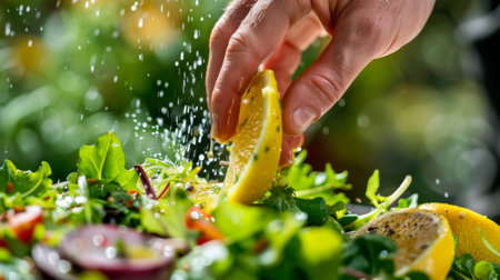 A close-up of a hand squeezing a lemon over a salad, with fresh greens and vegetables