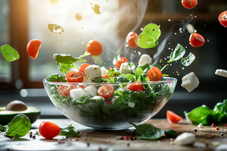 A vibrant scene showcasing a fresh salad being prepared, with greens and cherry tomatoes flying in motion, emphasizing healthy eating and cooking creativity.