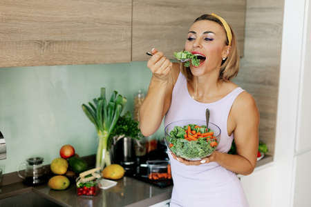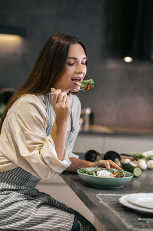 A young and happy woman is eating a healthy salad made from fresh ingredients standing at the kitchen table. Healthy food, healthy food, healthy lifestyle. diet, detox.