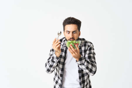 A funny woman eating salad greens. Costume with a plate of salad in his hands. Healthy eating and healthy food