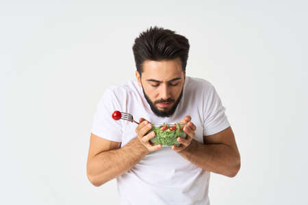 Young beutiful woman is eating salad for a fit body and healthy life. High quality photo