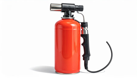 A red gas torch with a black handle and hose is presented on a white background. Clear details and vibrant col...