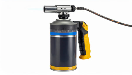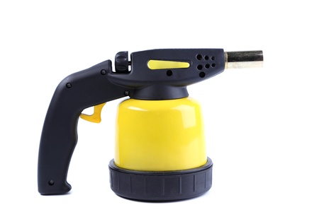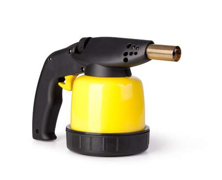 A blow torch with a gas canister, yellow handle, and blue stripe emits a blue flame on a white background.
