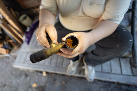Treatment of molten metal in the blacksmith workshop on blurred background, close-up. Old-fashioned manufacturing. Manual metalindustry. Traditional crafts. Art and crafts concept.