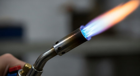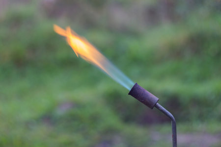 A close-up of a handheld gas blowtorch being operated, emitting a powerful blue and orange flame from its nozzle. The tool signifies intense heat, industrial work, construction, welding, or culinary applications.