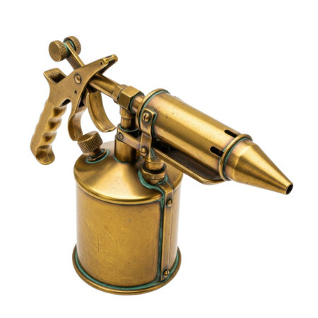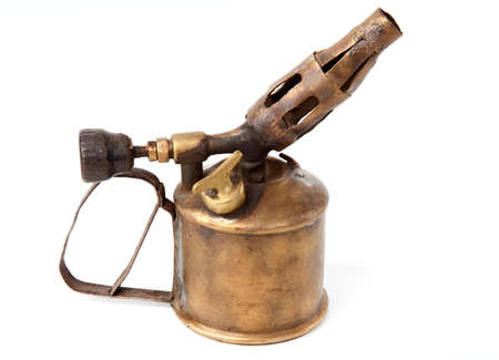 Detailed close-up of an antique brass blowtorch, showcasing intricate metalwork and a classic design. This vintage tool is perfect for collectors, artisans, and restoration projects.
