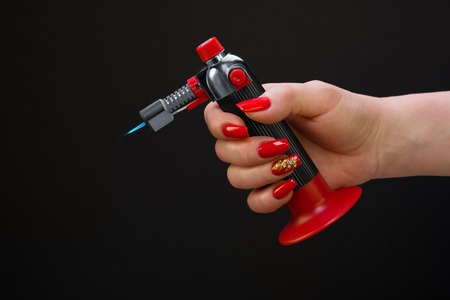Gas cartridge gun lighter .Close-up nozzle of burner with blue flmae