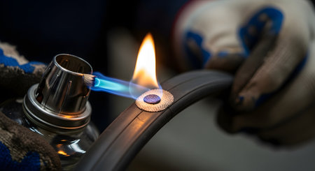 A close-up shot shows a mechanic wearing gloves using a blowtorch to heat a patch on a bicycle inner tube. The blue and orange flame is carefully applied in a hot vulcanization process to create a permanent seal over a puncture. This image captures a professional or traditional method of tire repair.