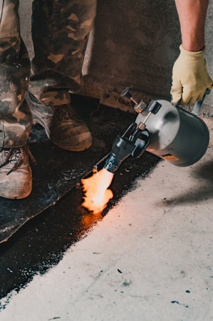 Details of waterproofing at house construction. Bituminous membrane waterproofing system with propane gas