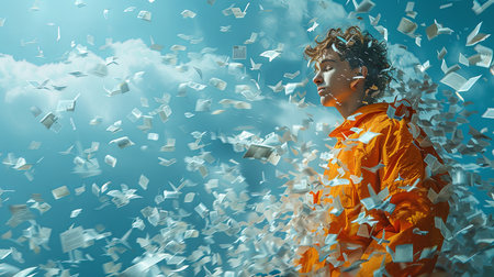 Young man in orange raincoat among flying paper sheets. Mixed media