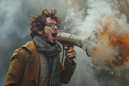 A man holds a vintage camera amidst swirling smoke, creating a mysterious and ethereal atmosphere