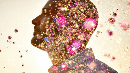 This artistic illustration features a man's profile filled with vibrant flowers, symbolizing nature's beauty and emotional expression, evoking tranquility and inspiration.