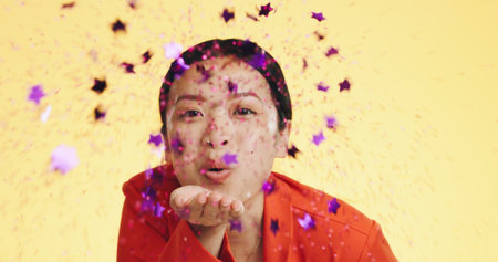 Close up girls lips blowing colorful confetti on yellow background