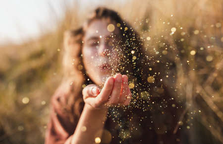 A beautiful shot of a model blowing glitter from her hand